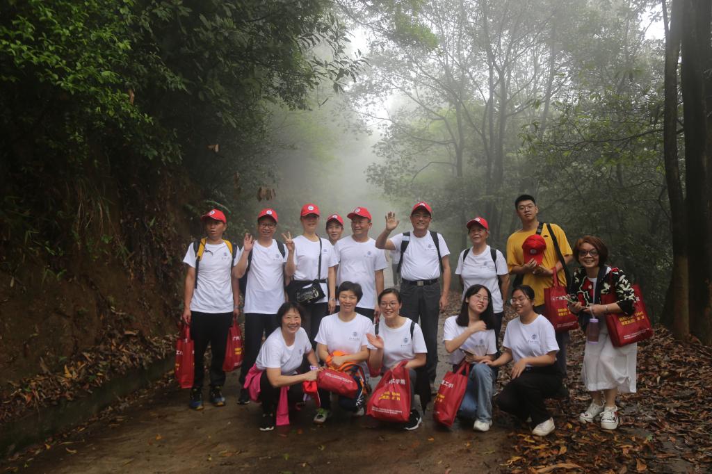 8:30分,随着一声出发号令,胡社军校长、黄圣诚书记等党政领导带领第一梯队率先出发,其他5个梯队的教职工紧跟其后。大家穿过穗丰村,从小石船景区直入山道,一路领略帽峰山森林公园的云山、迷雾、密林、繁花,听山涧林泉潺潺,看飞鸟穿过云林,在轻雾中向海拔534.9米主峰进发。