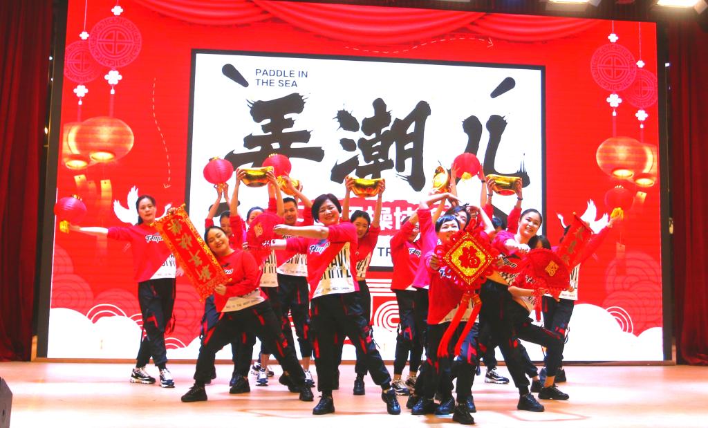 张世梅副校长带领工会团操协会队员跳了一曲活力迸发的《向快乐出发》,简单明快的舞蹈寄语教职工们要追求健康、积极向上,向快乐出发!