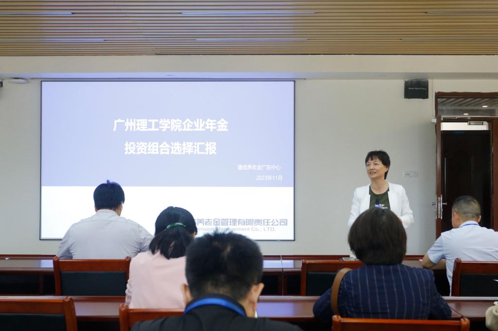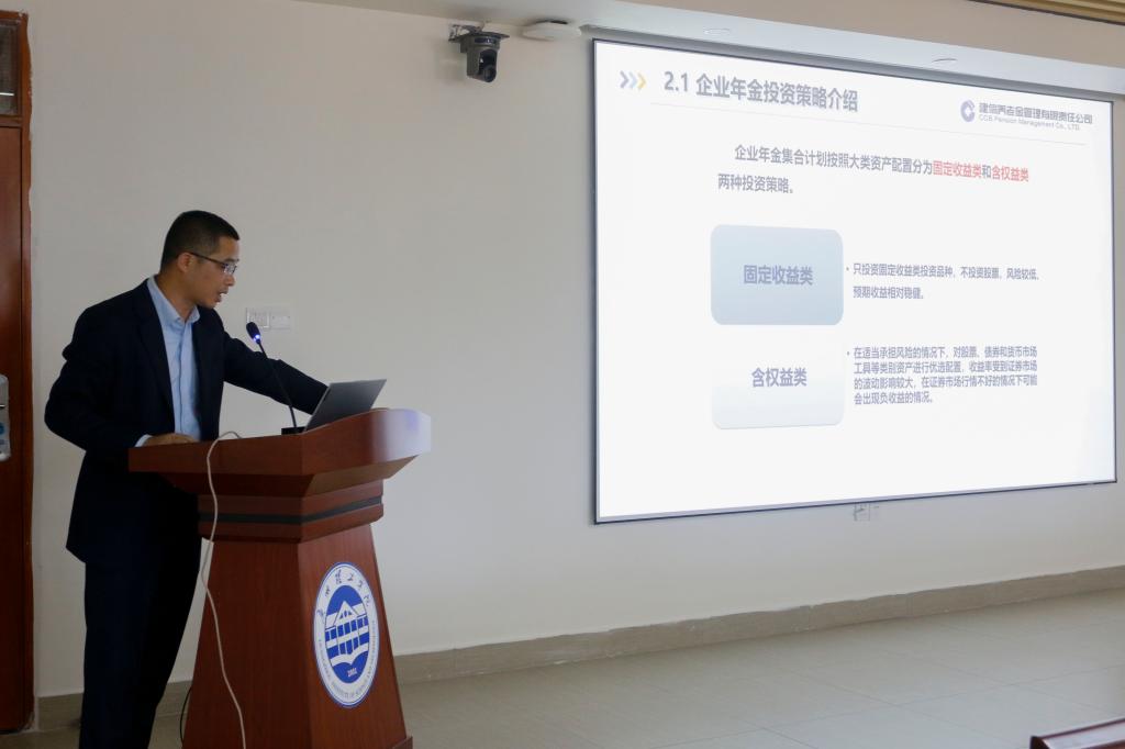 建信养老金管理公司广东中心的负责人代表从学院企业年金方案要点、投资组合汇报两个方面,就企业年金的政策背景及概念、企业年金对养老待遇的补充作用、企业年金方案重点内容等作了详实介绍。