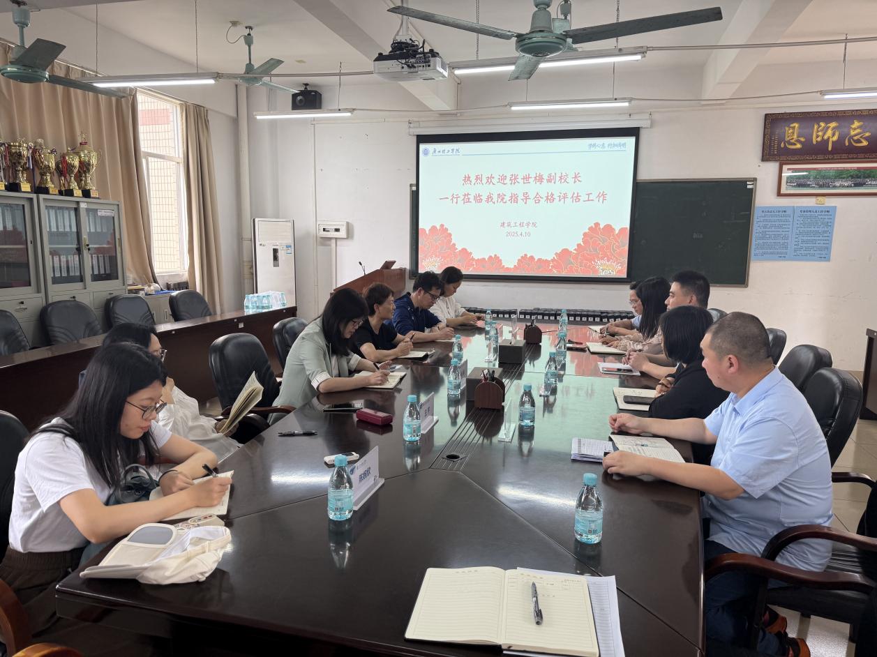4月10日下午,学校张世梅副校长带领质评中心马郁主任、陈英征主任、王宇主任等相关领导、老师到建筑工程学院调研评建工作推进情况并举行座谈会,学院党总支副书记马冠华、教学副院长杨林青、科研副院长李棱雪、评建专员侯庆华老师和赵乐萌老师参加会议。