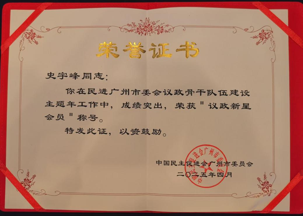 (通讯员:史宇峰)4月13日,民进广州市委员会召开“2025主题年”工作会议,会议表彰了议政先进集体和先进个人。我校williamhill威廉希尔史宇峰博士被评为议政先进个人,获得“议政新星会员”称号。