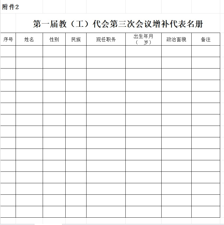 请各分工会于2023年4月13日前将《第一届教(工)代会第三次会议增补代表名册》(附件2)纸质版报送校工会,电子版通过OA发送至党办蔡伊咏老师。