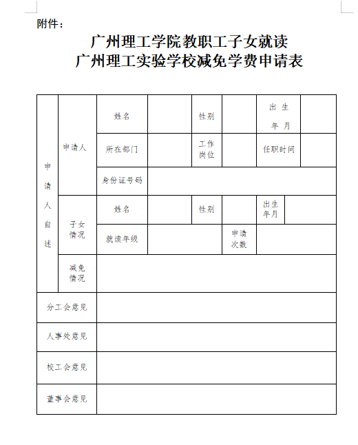 第八条 凡符合条件的教职工请通过OA填写《教职工子女就读广州理工实验学校减免学费申请表》,报分工会主席核准,校工会审批。
