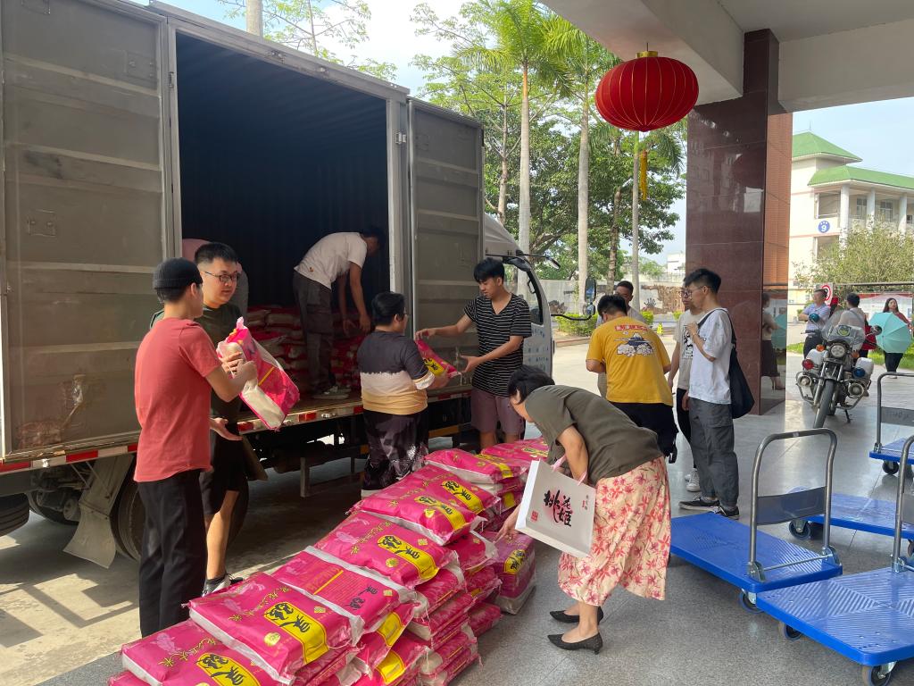 下午4点左右,一辆装着学校工会准备发给全校老师大米的货车正停靠在综合楼门前,但由于五一放假刚结束,搬运物资的师傅还没到岗,货车上近400包大米正在等待着搬下货车发放给即将下课的老师们。时间比较紧急之时,正在协助艺术学院唐雄老师更换实验室的消防器材的18环境3班、18环境4班张新新(中共党员)、肖子秋、宁华忠、方源、陈智轩、易家豪、招春飞、黄军志等8名男生主动前往货车停靠点联系负责老师,申请帮忙把物资搬下货车。在校工会办公室主任彭洁老师、艺术学院唐雄老师的指导下,经过8名男学生近半个小时的努力,近400包大米整整齐齐摆放在综合楼下,顺利发放给各部门。