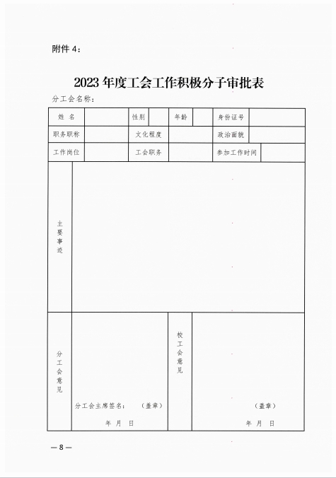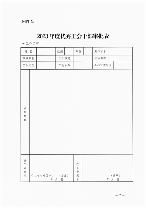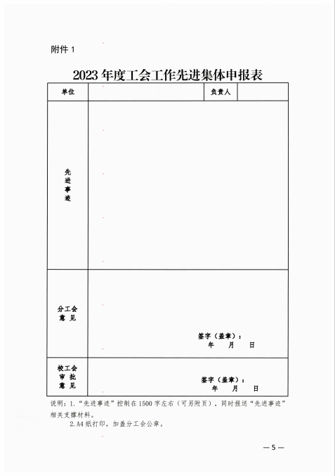 各分工会于2024年3月15日前将附件1《2023年度工会工作先进集体申报表》(含支撑材料)、附件3《2023年度优秀工会干部审批表》、附件4《2023年度工会工作积极分子审批表》和附件5《2023年度优秀工会干部、工会工作积极分子汇总表》上报学校工会办公室(行政楼818)联系人:彭洁。